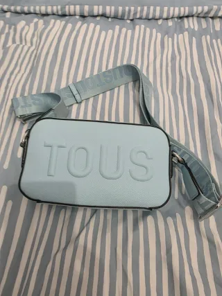 Bolso de la marca Tous en color azul claro. Presenta el nombre de la marca en relieve en la parte frontal y una correa ajustable con el logo. - Color: Azul claro - Correa con logo Tous