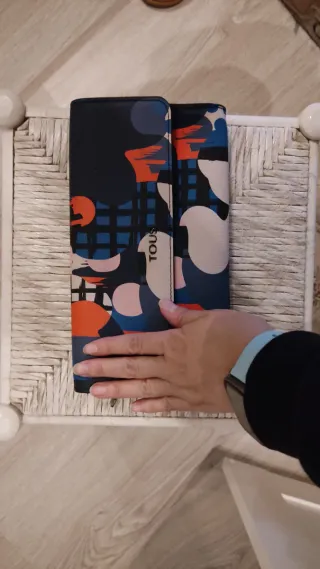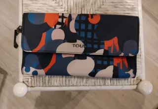 Bolso de mano Tous con un diseño llamativo y moderno. - Estampado abstracto con círculos y formas geométricas. - Combinación de colores vibrantes como azul, naranja y blanco. - Cierre de solapa con detalle metálico.