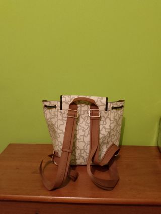 Mochila de la marca Tous con un diseño estampado. - Color principal beige con detalles en marrón. - Cierre de solapa con broche. - Asa de mano y correas ajustables.