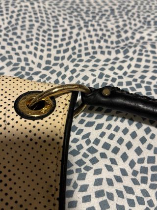 Bolso de la marca Tous con un diseño perforado. - Color beige con detalles en negro. - Asa de mano negra. - Logo metálico en la parte frontal.