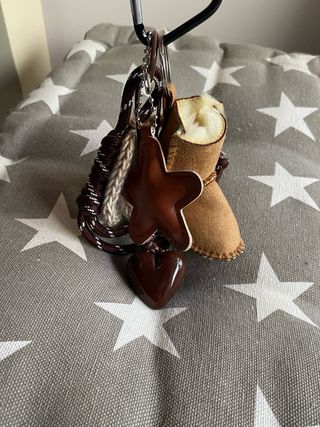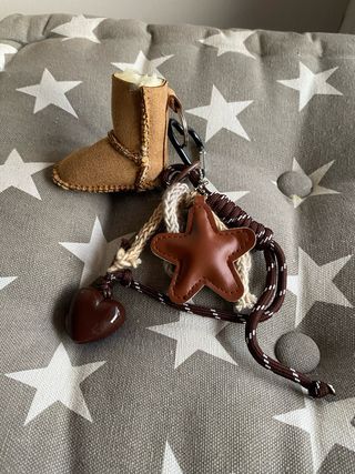 Llavero con forma de bota y charms. - Diseño de bota estilo Ugg. - Incluye charm en forma de estrella. - Incluye charm en forma de corazón.