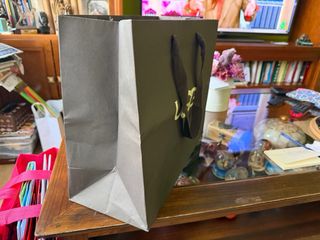 Elegante bolsa de la marca UGG en color negro. Presenta detalles en un tono dorado que le dan un toque distintivo. - Material: Papel - Color: Negro con detalles dorados - Asas de tela resistentes 40x33x18