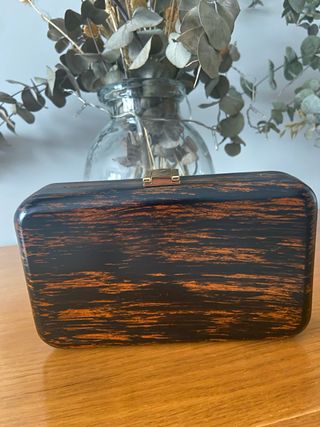 Elegante bolso de mano de la marca Uterqüe. Un accesorio sofisticado y único. - Fabricado en madera con un diseño elegante. - Asa de cadena dorada para llevarlo al hombro o cruzado. - Cierre de presión dorado. Nuevo, sin estrenar. De madera, combina muy bien con crudos, marrones chocolate y dorado. Puedes llevarlo en la mano o colgarlo de la cadena dorada que tiene dentro. Medidas 20x 12x4