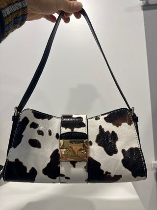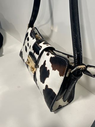 Bolso de mano con estampado de vaca, ideal para añadir un toque divertido a tu look. Cierre con broche dorado. - Diseño llamativo. - Asa negra. - Detalle de broche metálico dorado.