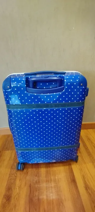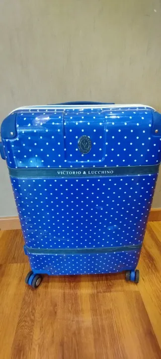Maleta mediana 60 X 43 x 25 con un divertido diseño de lunares. - Color azul vibrante con lunares blancos. - Diseño de la marca Victorio & Lucchino. La maleta está bien no tiene ningún desperfectos en el interior y las ruedas no tienen ningun tipo de holgura, estéticamente tiene marcas de roce en la parte inferior de la maleta y parte trasera pero que no afecta a su estructura y la manilla este si le no tiene freno así que no se mantiene arriba pero no dificulta para nada su trasporte.