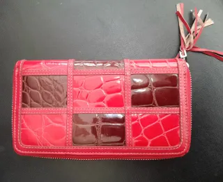 Cartera con diseño patchwork en tonos rojos y marrones. - Acabado brillante tipo piel de cocodrilo. - Detalle metálico con logo V&L. - Cremallera completa. - Adorno de flecos en uno de los laterales.