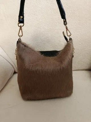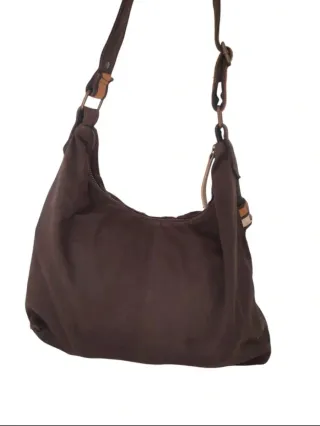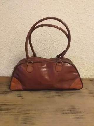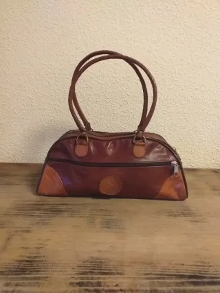 Bolso de piel artesanal de estilo vintage, con un diseño clásico y atemporal. - Material: Piel genuina. - Color: Marrón. - Cierres de cremallera. - Dos asas para llevar al hombro o en la mano. - Detalle circular de piel en la parte frontal. - Bolsillo interior - forrado interior con estampados florales Medidas 15 cm alto 25 cm largo 12 cm fondo Se aceptan ofertas razonables.