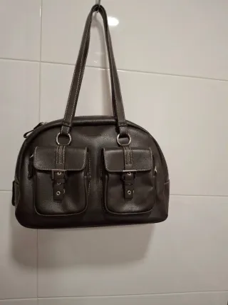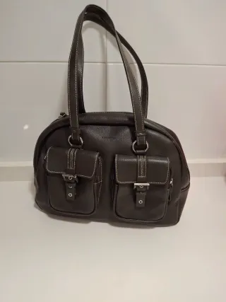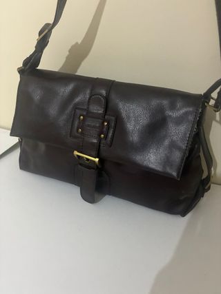Elegante bolso vintage de piel en tono marrón. Un accesorio clásico con un diseño atemporal. - Cierre de solapa con detalle metálico. - Asa superior para llevar en mano. - Diseño estructurado con compartimentos.