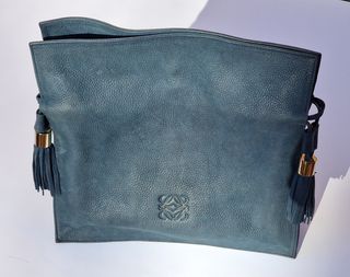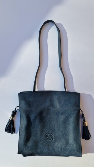 Bolso tote vintage de la marca Loewe. Auténtico bolso Loewe vintage de piel azul, medidas aproximadamente 30×30 cm. Interior beige con cremallera y etiqueta original Loewe. Asa para hombro, cierre magnético y borlas decorativas. Muy buen estado general. - Material: Piel. - Color: Azul marino - Adornos de flecos con detalles dorados. - Logo de Loewe grabado en el centro.