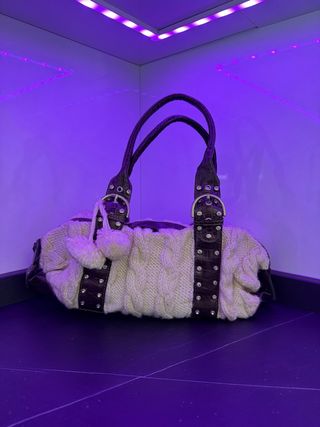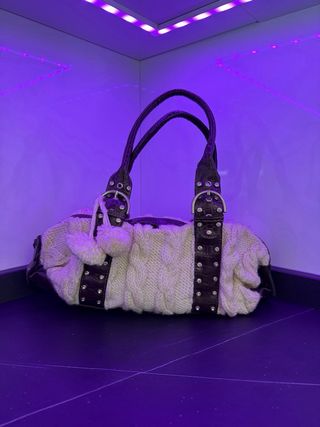 Bolso de estilo vintage con un diseño único. - Tejido de punto trenzado en color blanco. - Detalles en piel sintética con acabado de cocodrilo en color marrón. - Adornado con tachuelas plateadas. - Dos pompones decorativos.