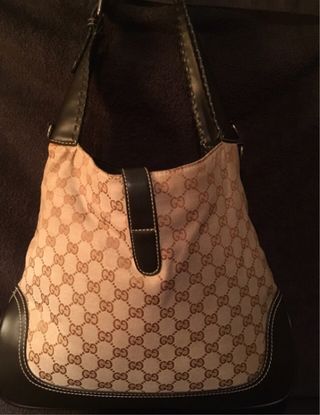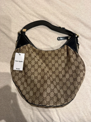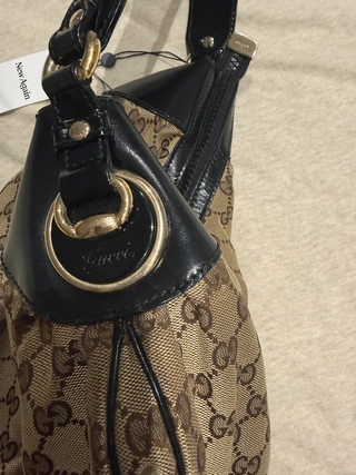Bolso de mano Gucci de estilo vintage. Un accesorio clásico con un diseño icónico. - Patrón GG característico. - Ribetes y asas en piel negra. - Cierre metálico distintivo.
