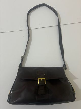 Elegante bolso cartera de piel estilo vintage. - Color marrón. - Cierre metálico dorado con llave - Correa ajustable.