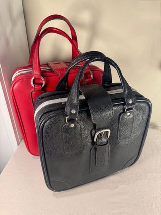 Set de dos bolsos de estilo vintage, con un diseño que evoca las décadas de los 60 y 70. Cada bolso presenta un acabado texturizado y detalles metálicos. Por dentro, el rojo el revestimiento necesita restauración. Por fuera, ambos son extremadamente patinados y muy sexys; quedan bien en cualquier ambiente. Medidas: el rojo aprox. 36 × 36 cm, el negro 32 × 36 cm. Excelente opción para transportar y almacenar discos vinilos