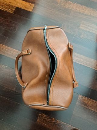 Bolso de estilo vintage con un acabado en piel sintética marrón. Ideal para viaje corto, usar como atrezo o dejar encima de un armario. La base mide 42x23cm y tiene un alto de 23cm. Cierre de cremallera y dos asas sin bolsillos.