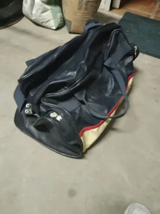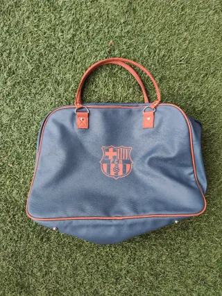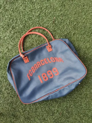 Práctica bolsa de deporte de cuero con el escudo del FCB. - Color azul. - Ribetes y asas en color marrón. - Diseño vintage