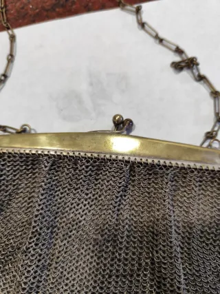 Elegante bolso de malla de estilo vintage. Su diseño intrincado lo hace un accesorio único. - Confeccionado en malla metálica. - Cierre de broche. - Adornos en la parte superior.