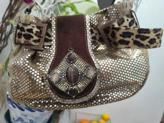 Bolso de mano con un diseño único y llamativo. - Acabado con lentejuelas doradas. - Detalles en estampado de leopardo. - Adorno central con piedras. - Cierre con hebilla. Muy estilo bratz, lo he usado una vez. A estrenarrr