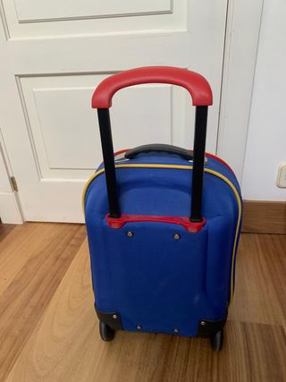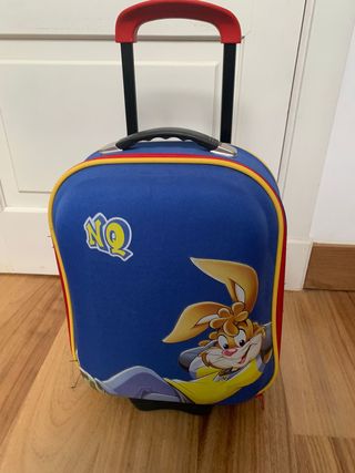 Vendo maleta tipo trolley original de la marca Nesquik. Es un artículo de merchandising vintage, difícil de encontrar en este estado. Características: Diseño: Color azul con el mítico conejo Quicky y el logo "NQ" en el frontal. Funcionalidad: Tiene 2 ruedas traseras y asa telescópica extraíble (mango rojo) que funciona perfectamente. Cierre: Cremallera en perfecto estado. Material: Semi-rígida (tela resistente sobre estructura dura). Estado: Muy buen estado de conservación. Las ruedas giran bien y la tela no tiene rotos. Ideal para escapadas de fin de semana de los peques o para coleccionistas de artículos publicitarios