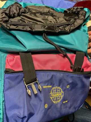 Mochila grande estilo vintage de la marca Pull&Bear, ideal para montaña o uso diario. Diseñada con un llamativo contraste de colores. - Compartimento principal espacioso. - Bolsillo frontal con cierre de cremallera. - Tirantes ajustables y acolchados.