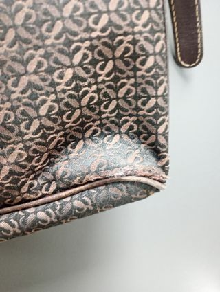 Loewe. Vintage. Bolso bandolera, forma similar a cubo. Textil lona gruesa con el logo de la marca repetidos permanentemente en marrón oscuro y negro. Ribetes y correa napa pura piel marrón oscuro. Medidas: 23*24*9 fondo. Cierre con cremallera. Tirador de la cremallera en metal con logo grabado, hebillas doradas de la correa con el logo Loewe grabado en los laterales. Tiene señales de uso, nada roto pero desgaste en los laterales de apoyo, fácil de reparar en zapatero cuando quieras, y poco más. Las fotos son muy claras. Precio muy ajustado por eso.