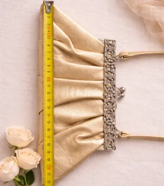Bolsa en tono dorado champagne con acabado ligeramente satinado y textura suave. Modelo estructurado con marco metálico trabajado en tono plateado y cierre tipo kiss lock doble, un clásico atemporal que aporta elegancia y carácter al instante. El cuerpo presenta delicados frunces frontales que crean un movimiento sutil y refinado. Asa corta fija para llevar al hombro o en la mano. Interior forrado en tejido satinado dorado, con bolsillo interno. Es una pieza perfecta para eventos, bodas, celebraciones, cenas especiales o para elevar cualquier look con un toque retro chic. ✨ 📏 Medidas: – Altura: 10,5 cm – Ancho: 24 cm