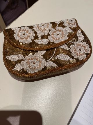 Elegante bolso vintage, perfecto para ocasiones especiales. Su diseño intrincado lo hace destacar. - Adornado con cuentas. - Cierre de broche. - Forro interior con diseño. - Compartimento interior.