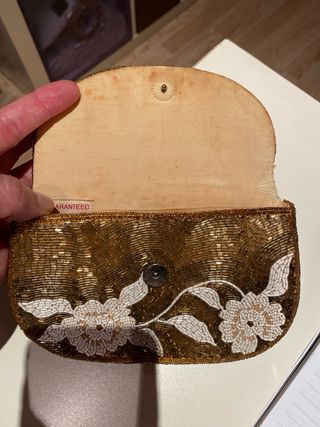 Bossa de mà elegant, ideal per festa i cerimònia. Tancament de solapa a pressió. Amb 2 petites butxaques interiors. Fa 25.5 X 11.5cm. Vintage 1920. Bolso de mano elegante, ideal fiestas, eventos y ceremonias . Con 2 pequeños bolsillos interiores.