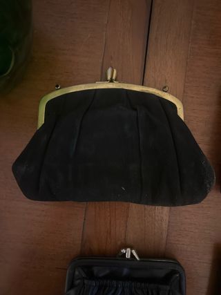 Preciosos bolsos de fiesta vintage. Uno de ellos está hecho de piel y el otro de tela. Ambos tienen un cierre tipo broche antiguo y dorado. Son ideales para ocasiones especiales. - Bolso de piel marrón, con textura suave. - Bolso de tela negro, con pliegues elegantes.