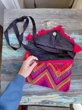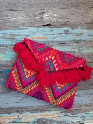 Bolso de mano comprado en Mexico, con un vibrante diseño geométrico (sobretodo rojo) y flecos decorativos.