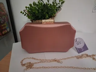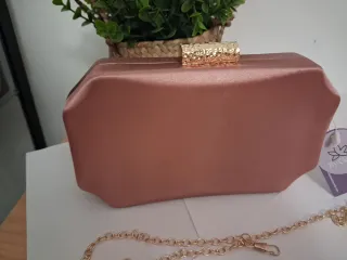 Bolso de mano tipo clutch en un bonito tono rosa, perfecto para ocasiones especiales. Incluye una cadena dorada para llevarlo al hombro. - Acabado satinado. - Cierre metálico dorado. - Diseño elegante. Elegante bolso tipo clutch, perfecto para eventos especiales. Vendo este maravilloso clutch o bolso de fiesta nuevo a estrenar, color rosado satinado y cadena dorada, perfecto estado. 20 cms largo x 11 cms alto x 3 cms de ancho. Tiene una cadena larga dorada o bien lo puedes usar sin ella 🥰