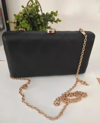 Bolso de mano tipo clutch en color negro, con un diseño acolchado y detalles metálicos dorados. - Cierre de broche. - Cadena dorada desmontable. A estrenar, perfecto estado. MEDIDAS: Ancho: 4cms x Alto: 11 cms x largo 20 x 120 cms de cadena. 💕HAGO ENVÍOS💕