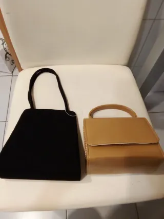 2 Pequeños bolsos vintage de fiesta , para decorar o usar asi. Ambos en muy buen estado. Negro : ancho 18 cm , alto 17,5 cm , fondo 6,5 cm . Beige : ancho 16 cm, alto 13 cm , fondo 8 cm. Los dos : 6 euros.