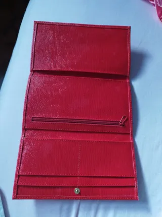 Elegante cartera de la marca Pierre Cardin. - Diseño en color rojo. - Acabado texturizado. - Cierre de botón a presión. - Compartimentos interiores, tarjetero, billetero y monedero con cremallera. - Plaquita dorada con la firma. - Nueva, sin ningún uso. - Vintage. - Mide cerrada 20x11'5 cm. *** Hago lotes en un sólo envío, consulta mi perfil y hsblamos.