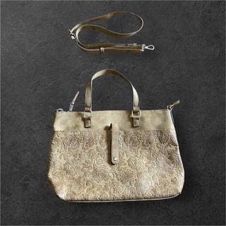 Elegante conjunto de zapatos de tacón y bolso de mano a juego, en un llamativo tono dorado con un diseño floral. - Zapatos tipo slingback con tiras al tobillo. - Bolso de solapa con cierre. - Diseño floral grabado en toda la superficie.