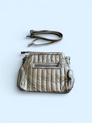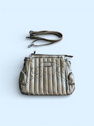 Bolso de mano o bandolera de estilo vintage. - Diseño acolchado con costuras verticales. - Bolsillos exteriores con cremallera. - Correa ajustable y extraíble.
