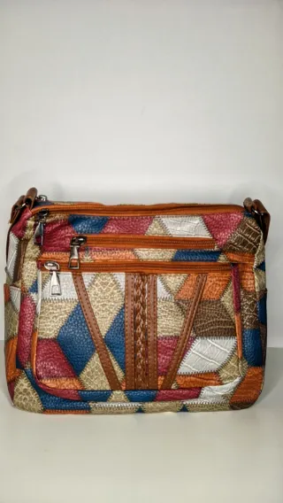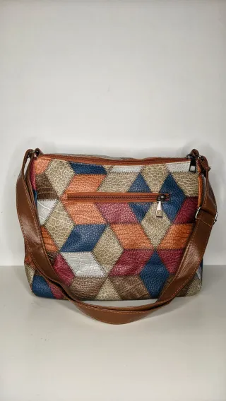 Bolso cruzado estilo vintage, confeccionado en piel sintética con diseño patchwork. - Acabado multicolor con detalles en marrón. - Cierre de cremallera. - Múltiples bolsillos exteriores.