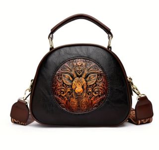 Bolso de estilo vintage para mujer, con un diseño único y detalles elaborados. - Material: Cuero. - Diseño frontal con relieve de ciervo y motivos ornamentales. - Asa superior y correa ajustable para llevar al hombro.
