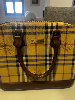 Bolso Burberry auténtico, modelo vintage Clásico diseño con estampado Burberry en tonos beige/amarillo y detalles en cuero marrón. ✨ Detalles: • Asas y base de cuero • Cierre con cremallera • Interior forrado con el icónico estampado del caballero Burberry • Bolsillo interior con cremallera • Pies metálicos en la base Precio negociable!!!