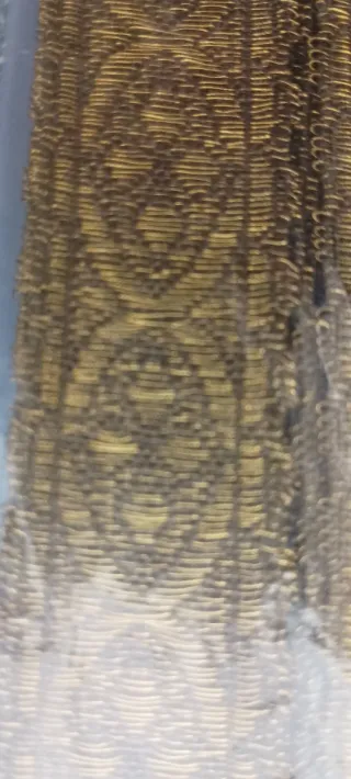 Preciosa pasamanería o galón con un diseño intrincado. Las bolsas se abrieron para poder ver bien las imágenes.(Sin estrenar nuevo) "La etiqueta se le hizo a mano, estaba muy desgastada". - Tejido con hilos dorados y beige. - Patrón de círculos entrelazados. - Borde con detalle festoneado.