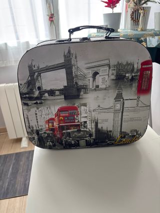 Maleta con diseño inspirado en Londres, perfecta como elemento decorativo. Tiene algo de pintura blanca en el asa, tal y como se ve en la foto. - Ilustraciones icónicas de Londres. - Estilo vintage.
