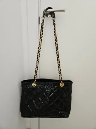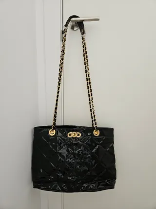 Bolso vintage con cremallera. 39 x 26 cm En perfecto estado en el interior con un bolsillo con cremallera en el interior. - Acabado en charol brillante. - Cadena de metal dorada para llevar al hombro. - Detalle acolchado. - Cierre con eslabones dorados. También tengo un bolso marrón con estampado por 20€ (las últimas 3 fotos) 👀 **** Shoulder bag zipper black shiny retro glossy metal