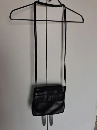 Bolso de piel negro con un diseño elegante. - Cierre de cremallera principal. - Bolsillo exterior con cremallera. - Correa ajustable para llevar al hombro.