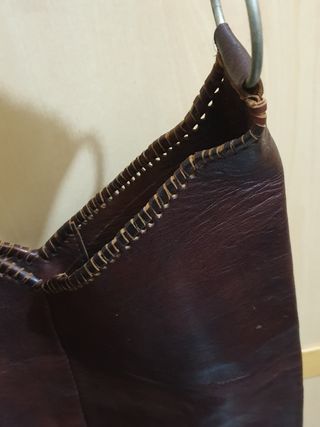 Bolso de mano de piel en tono marrón, con un diseño clásico y atemporal. - Material: Piel genuina. - Color: Marrón. - Detalles: Costuras blancas y remaches metálicos.