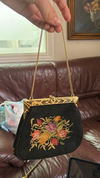 Elegante bolso de mano estilo Art Decó de los años 30. Un accesorio vintage con un diseño floral bordado. Accesorio antiguo, con mas de 100 años pero en perfecto estado. - Cierre metálico dorado. - Cadena dorada para llevar al hombro. - Bordado floral multicolor sobre fondo negro.