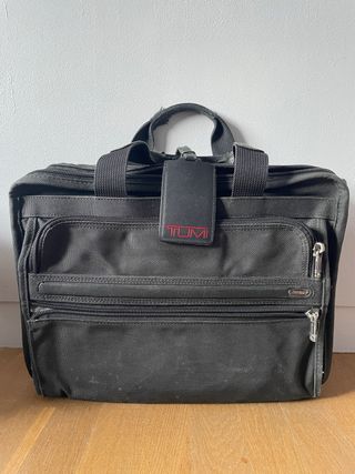 Maletín Tumi de estilo vintage, ideal para transportar tu ordenador y documentos. - Diseño clásico y funcional. - Compartimentos interiores para organización. - Asa de mano reforzada. - Cierre con cremallera.