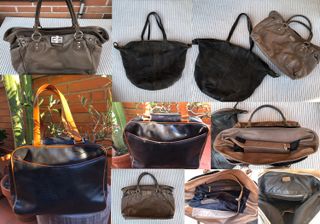 Lote 4 Bolsos de mano vintage (el 4o no aparece en fotos; será similar a l Farrutx en dimensiones, parecido a marca L.V., preguntar por más info) 1. Bolso de mano FARRUTX. Estampado monograma "FF" sutil negro. Asas piel color camel. Bolsillo pequeño interior y bolsillo grande exterior (cierre imán redondo). aprox. 26x34x8 (asas 55cm). 2. BRUSSOSA (BCN) de Piel Verde oscuro. Estilo desestructurado. Con anillas en extremos. Dos bolsillos pequeños internos. 58x34 cm 3.Bolso Marrón Grisáceo (marca:?). Bolsillos externos en laterales y frente/trasero, 3 bolsillos internos. Estilo Bimba y Lola o Guess. 32x40x18