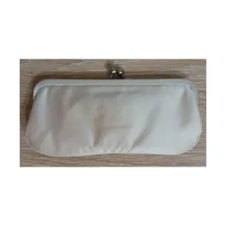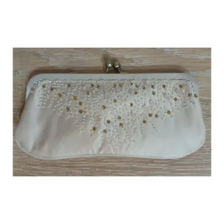 Elegante bolso de mano en color beige, ideal para eventos especiales. Presenta un diseño adornado con pedrería y detalles anaranjados. - Cierre de boquilla. - Bolsillo interior. - Correa extraíble. - Vintage, años 80s - Acabado satinado. - Defecto por uso detrás, foto 2 Medidas: 24,5*10,5*2 cm (largo*alto*profundidad)