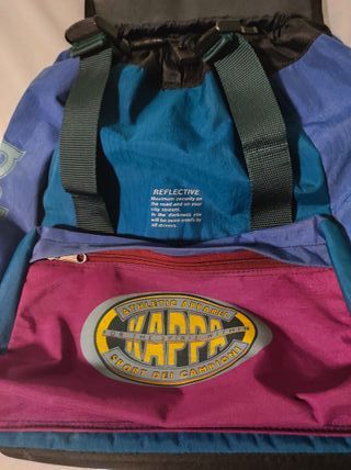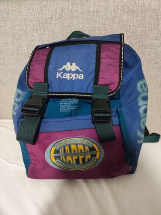 Mochila vintage de la marca Kappa con un diseño llamativo en tonos azules y morados. Ideal para el día a día o para coleccionistas. - Logo de Kappa en la parte frontal. - Cierre con hebillas. - Estampado Kappa Sport Dei Campioni en la parte inferior. - Detalles reflectantes. - Tal como se ve en las imágenes, tiene mi nombre escrito.