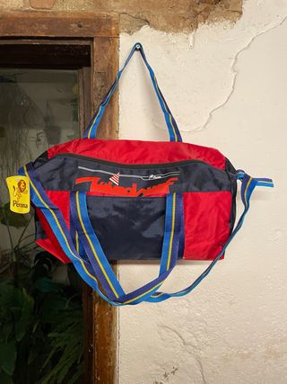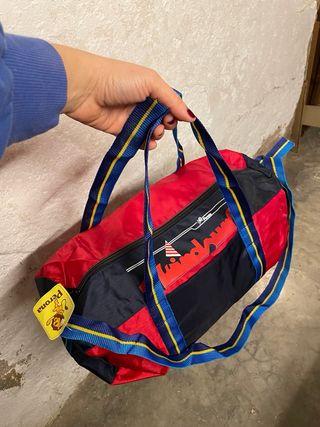 Bolso deportivo vintage con etiqueta. - Diseño en color azul y rojo. - Asas con rayas azules y amarillas.