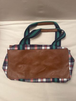 Bolso de mano vintage de Tommy Hilfiger con un diseño a cuadros clásico. - Asa de cuero y correas de tela con rayas. - Placa metálica con el logo de la marca en la parte frontal. - Combinación de colores marrón y multicolor.